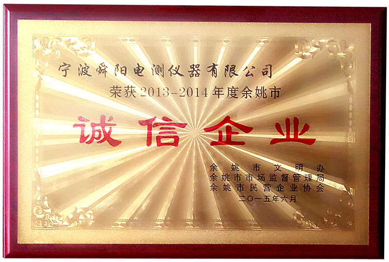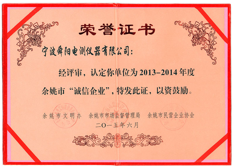 2015年6月,被余姚市文明辦、余姚市市場(chǎng)監(jiān)督管理局、余姚市民營(yíng)企業(yè)協(xié)會(huì)聯(lián)合評(píng)定為2013-2014年度余姚市“誠(chéng)信企業(yè)”