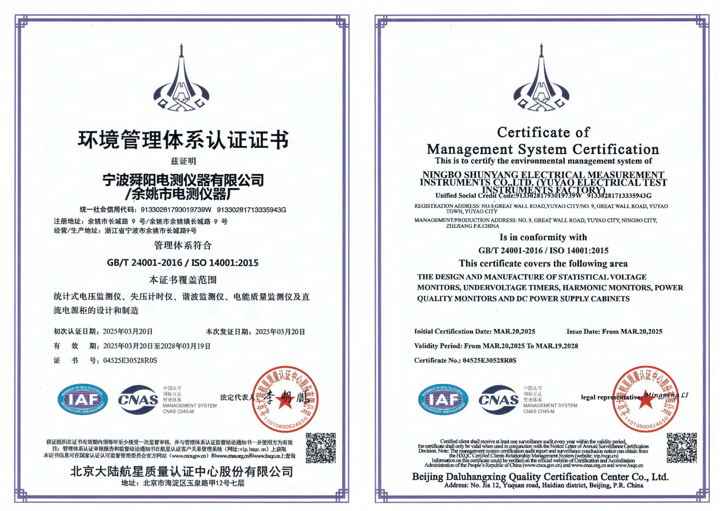 近日,我司收到了北京大陸航星質(zhì)量認證中心公司簽署的環(huán)境管理體系認證證書,從而表明我司通過了相應的審核,有效期:2025.03.20~2028.03.19。