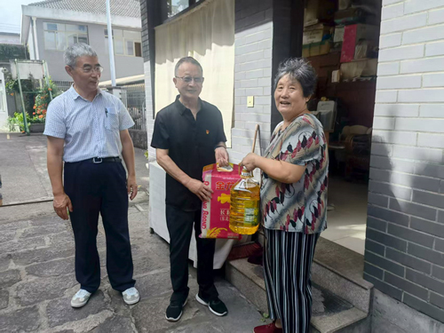 高文祥同志(照片,中)是我們支部黨齡最長的老黨員,也是退伍老軍人,2023年就獲得了光榮在黨五十年紀(jì)念章,今天老早就來到了支部辦公室,精神抖擻地準(zhǔn)備參加送溫暖活動(dòng)。上面照片,他正向張婉芳送米油。